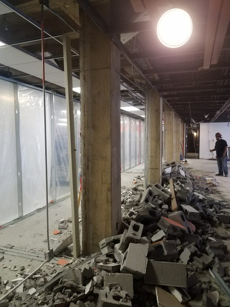The first phase began in early spring with the demolition of a wall that separated an exercise studio from the rest of the fitness center and combined the two areas into one functional space. The addition now allows natural light from the windows to shine through the rest of the fitness center, brightening the overall space. The ceiling was also replaced.